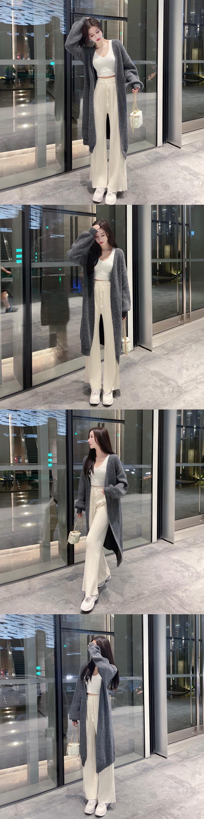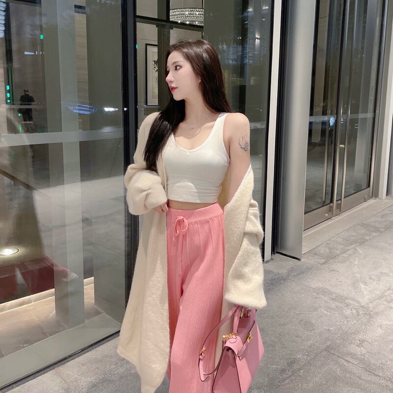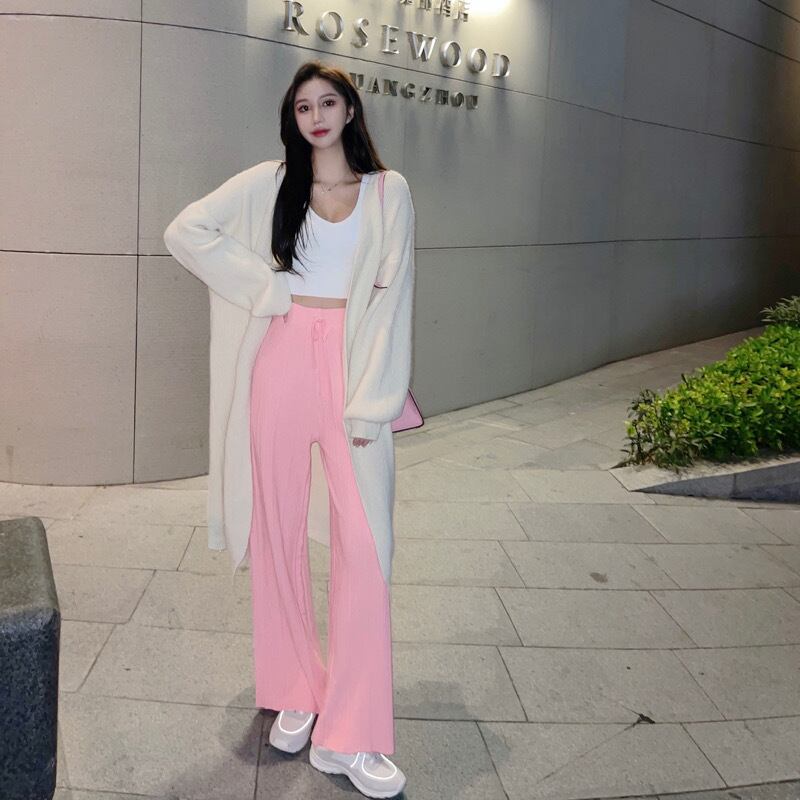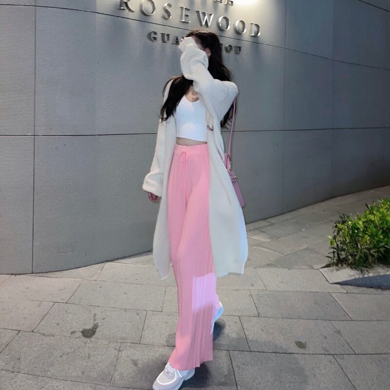 色:白いセーター,グレーのセーター,オフホワイトのワイドレッグパンツ,ピンクのワイドレッグパンツ