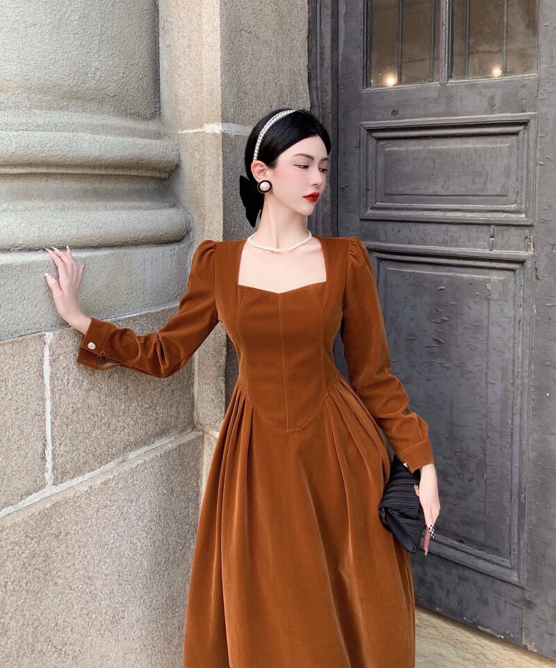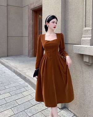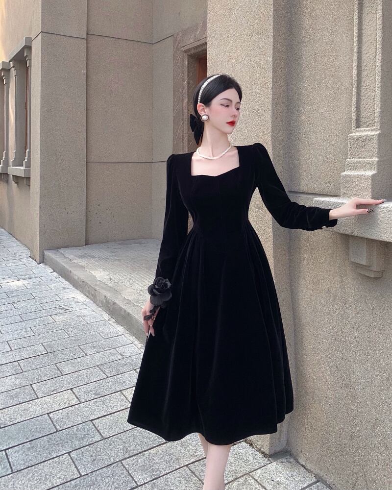 スタイルドレス ウェストベルベットロングカラーオータムウィンタースタンダードスカート レトロ 秋物 冬物 スクウェア Xiaofeijia66508122428