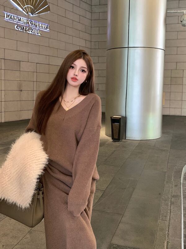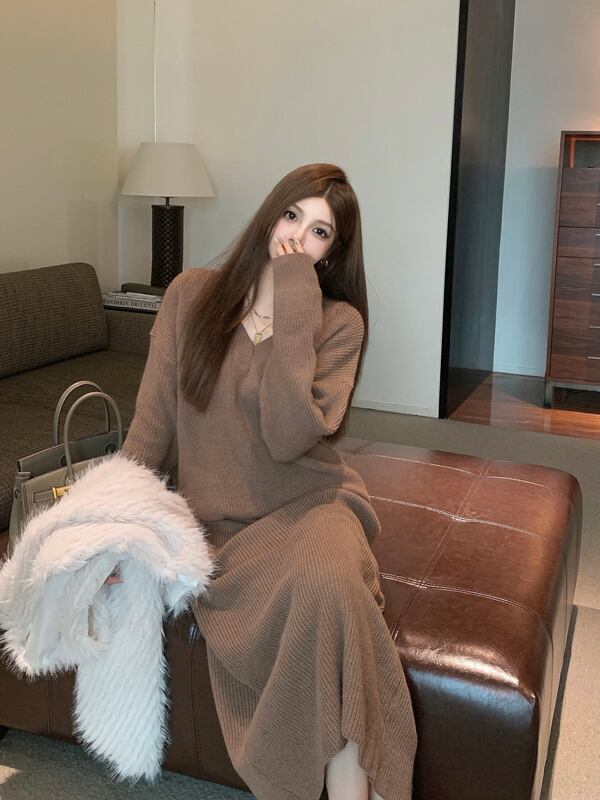 ウィンタースタンダードセーター スカート スタイルVネックニットトップス バックスリット レトロ 冬物 Xiaofeijia28604772016