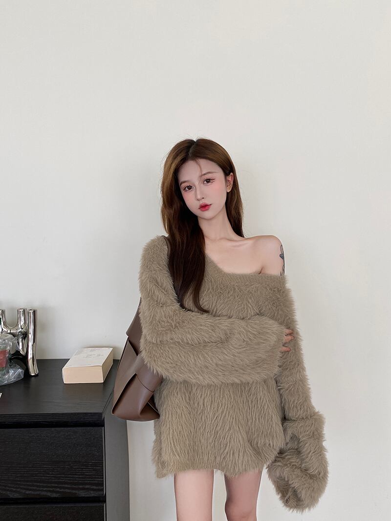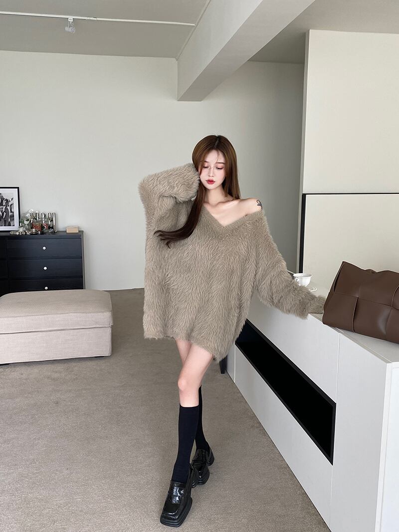 ルーズVネックニットセーター レディースオータムウィンタートップス 秋物 冬物 Xiaofeijia75882143661