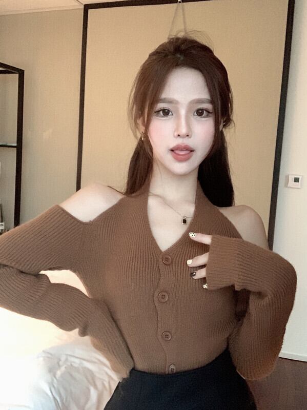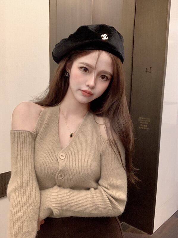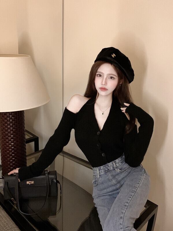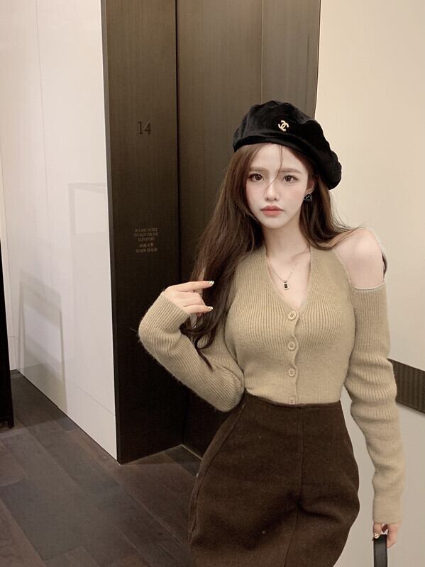 オフショルダートップス オータムウィンタースタイルスタンダードVネックセーター ショートカーディガン ロング レトロ 秋物 冬物 Xiaofeijia91676553786