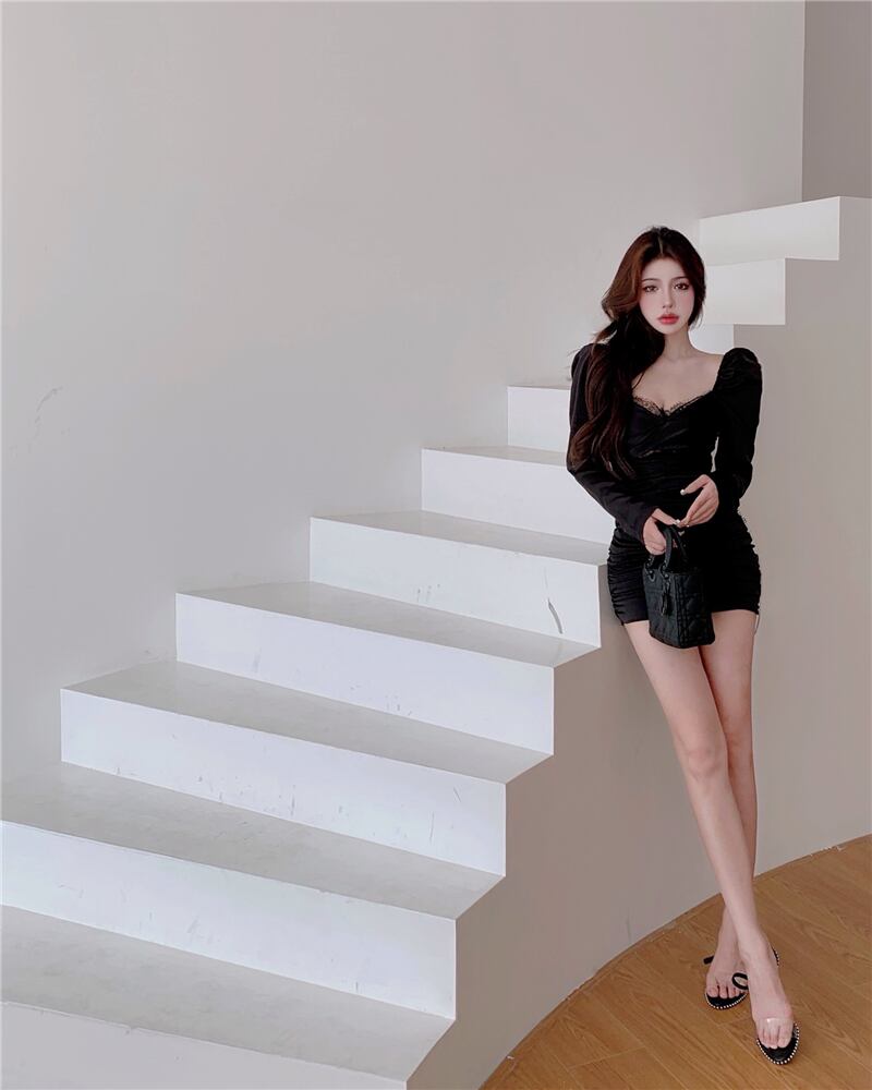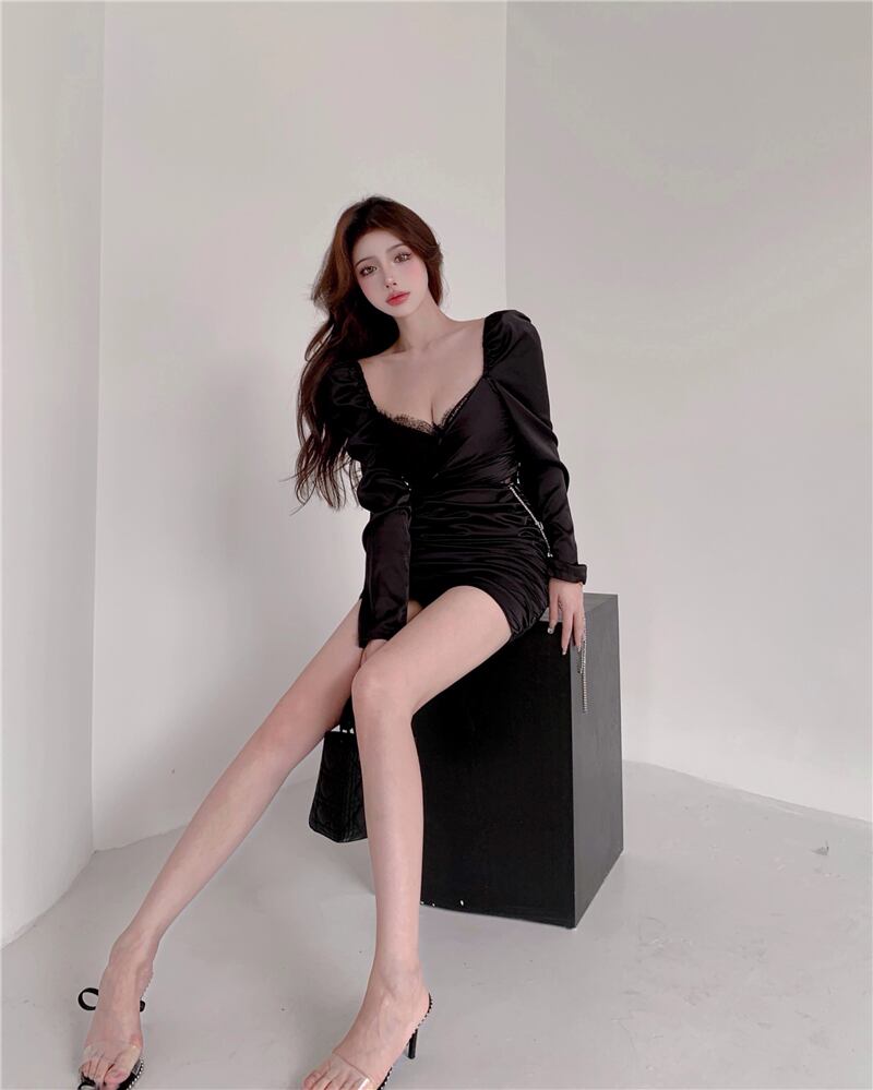スタイルドレス オータムレースサテンショートスカート スリーブ 大人ガーリー スウィート キュート カジュアル 秋物 ステッチ Xiaofeijia41528850873