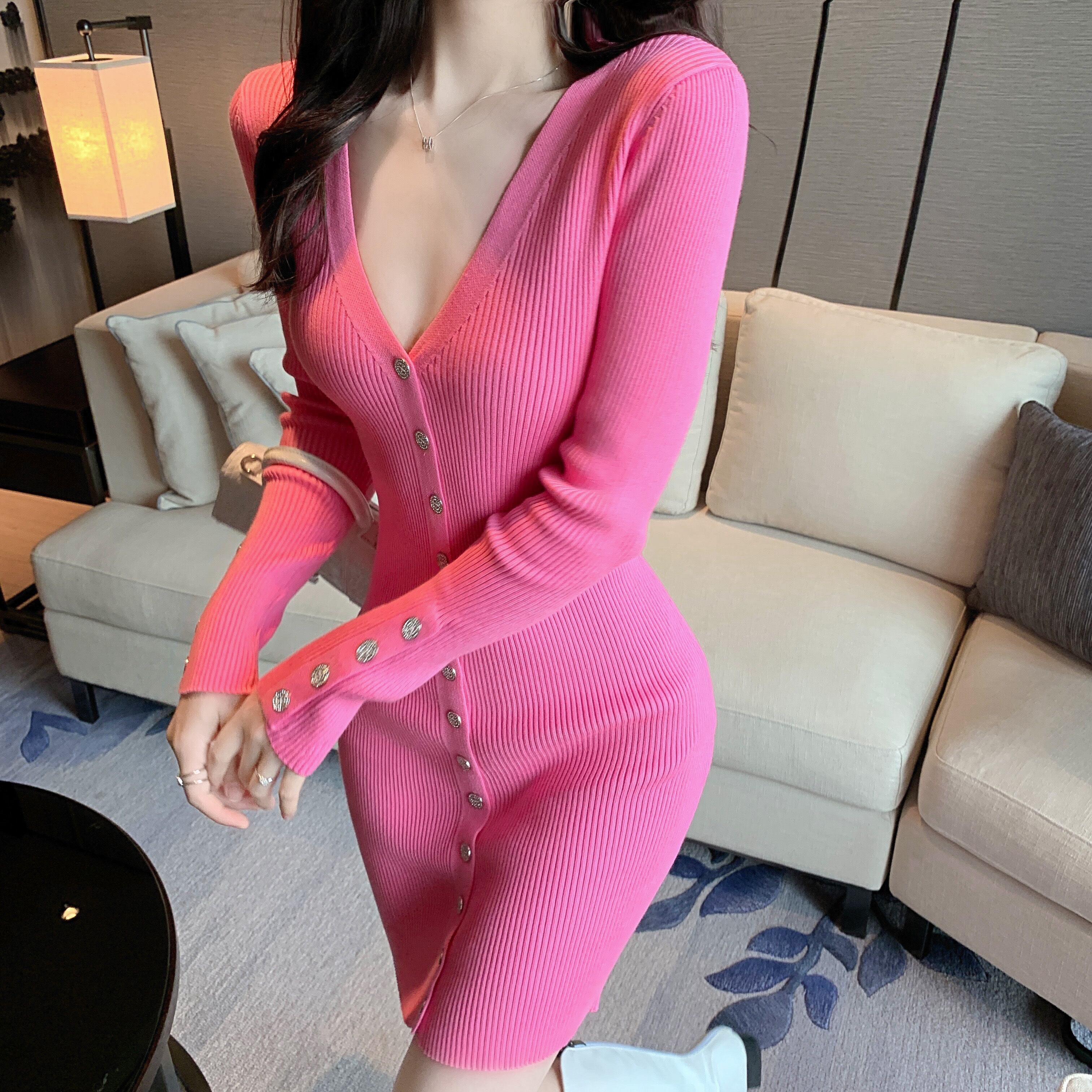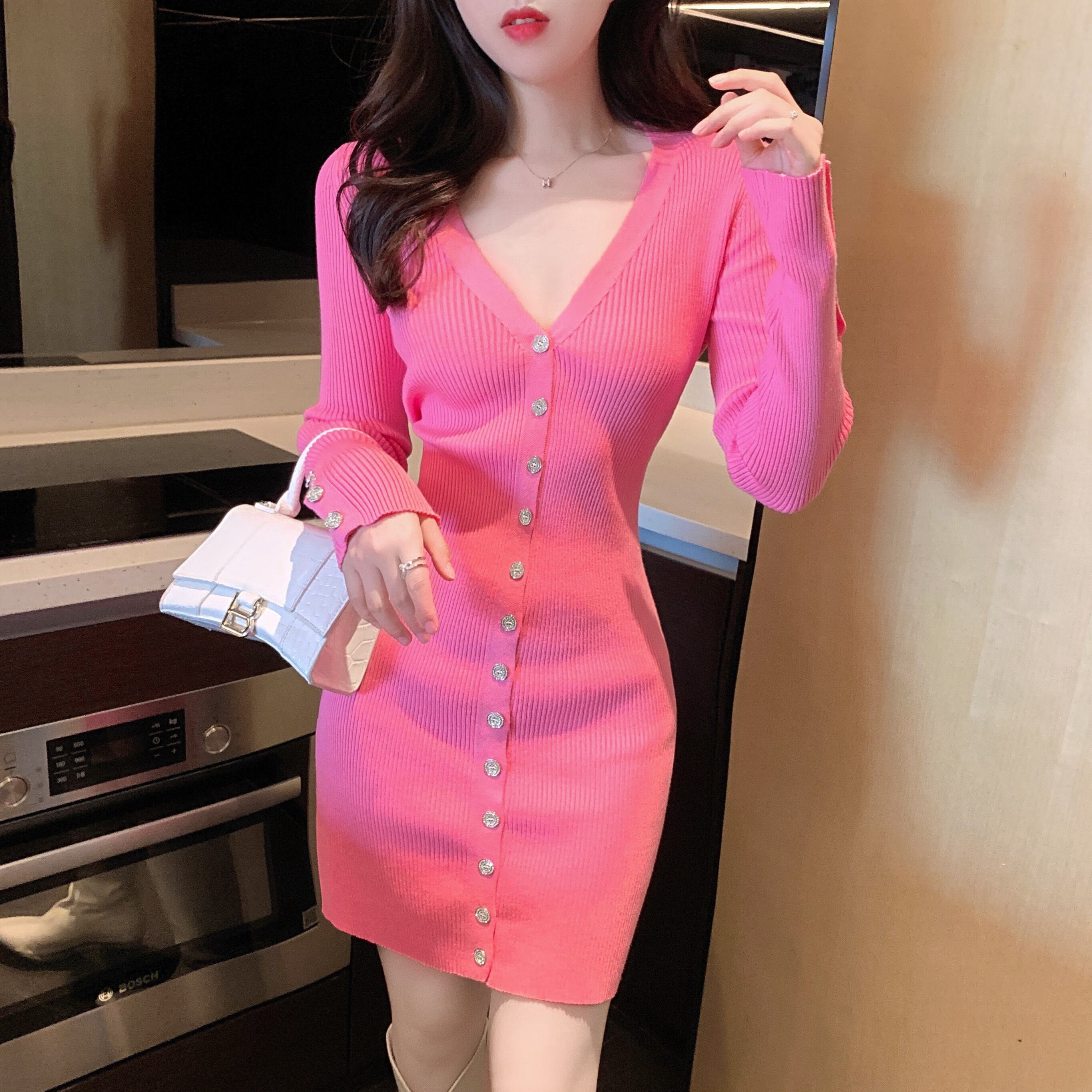 オータムウィンターホワイトバックルVネックニットスカート 秋物 冬物 ピュア Xiaofeijia83548827500