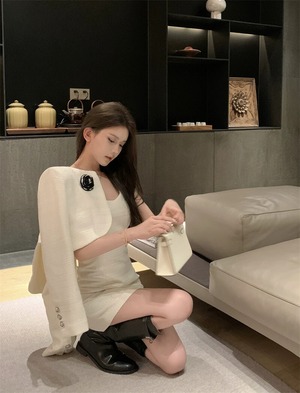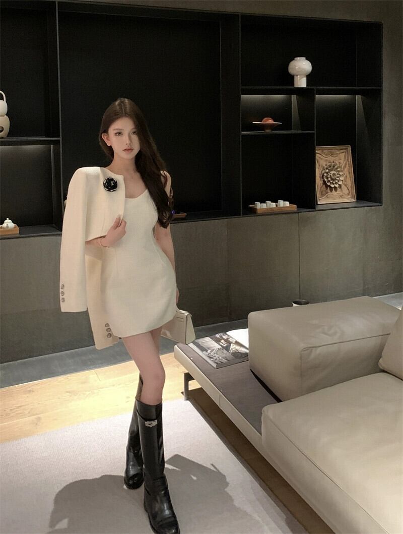 軽くて大人の小さな香りのスタイルのツイードスーツの女性 2023 秋冬白ショートコートサスペンダードレスツーピーストレンディなセット ホワイト オータム 秋物 ウィンター 冬物 Xiaofeijia28818826949